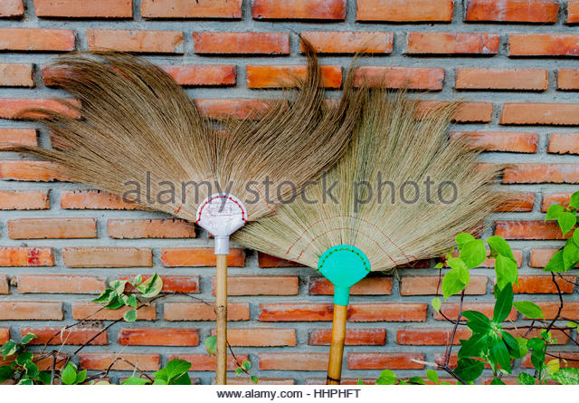 two-traditional-thai-brooms-against-a-brick-wall-with-some-green-leaves-hhphft