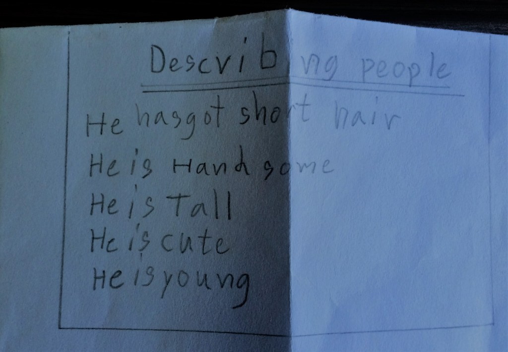 Yet, one letter stood out amongst them all and the student that gave me the card is the reason for the title of this article. On the front of the card were heart stickers, colorful hand drawn roses, and stick figures of myself and the student. The back of the card made me cry. Many of the kids had the other English teacher write a sentence for them and many had the same line as above, which is no less wonderful and thoughtful. But, when I turned over Fa’s card, there was “Describing people: He has got short hair, he is handsome, he is tall, he is cute, he is young”. Not only did she do this on her own, it was also accurate (see: He is handsome).