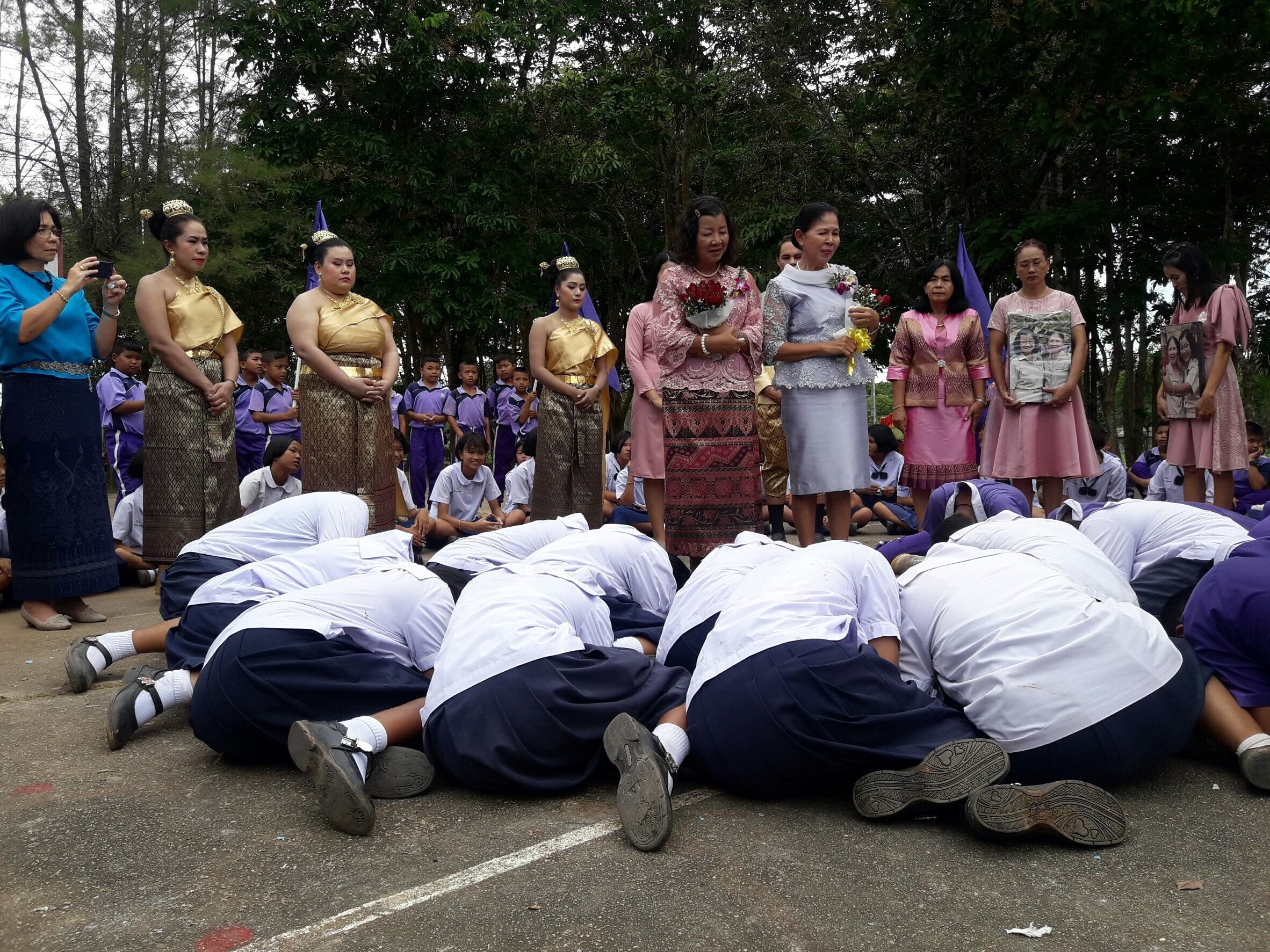 It’s an overcast morning in late September. The faculty have arrived at school in traditional Thai dress, and soon we find ourselves in two lines. Two elderly teachers, Aunt Su and Aunt Dang, lead our procession out into the assembly area. We walk through rows of welcoming students into the middle of the space. And then we deposit Aunt Su and Aunt Dang at the center of the circle. Today marks their retirement, and I wonder if leaving them alone is symbolic somehow. The rest of us form circles around them, faculty and VIPs in the inner circle, layers of students surrounding us. The local marching band rounds the corner, the men playing drums and cymbals and an electric keyboard, the women leading a synchronized traditional dance routine. I see my host mother in there, elegant, somewhere in the middle of it. The community watches from the balconies of the school buiding as we join in the dancing, circling counter-clockwise, and as the band joins closer I get lost in the swirls and the rhythm, swept up like dust in a hurricane. And in the center of it all, two figures stand motionless, tears streaming from their eyes … and then suddenly we stop. 10 students make their way to Aunt Su and Aunt Dang, kneel in front of them, bow their heads, and with tears in their eyes they take turns to say just one thing to their retiring teachers.