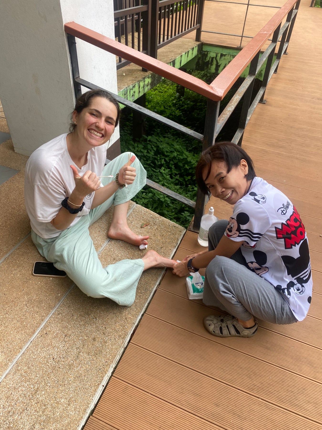 Dito still lives less than a 10-minute bike ride away from his former host family’s gorgeous Thai traditional house, and they invite him over often for meals, to use their washing machine, joke around with his host brothers, and play with their dogs who absolutely adore him. When we went there in the morning to do laundry his host brother cut down some coconuts from the family’s tree while we waited to take our clothes out to dry, and the whole scene was very idyllic.