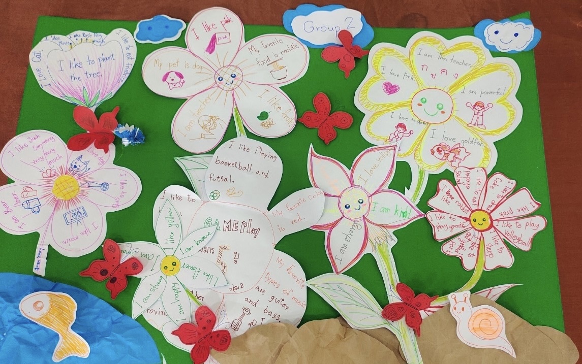 Words of affirmation are not something you hear often in a Thai classroom. My students make fun of my overuse of “Excellent” and “Good job” because they’re not used to hearing this kind of talk. They’re not used to daily doses of reassurance. But one thing I’ve learned is that no matter where you’re from or what language you speak, it feels good to hear positive things about yourself, especially when learning a new language. I wanted my camp day to serve as a reminder, to empower my teachers and give them the words to describe themselves in the most positive way by using “I am” statements. It was fun to attach an action to every word. I find it’s easier for students to remember the meaning of a word if they can associate it with a movement. For strong and brave we flexed our muscles, for blessed we bowed with our hands in prayer. For smart we patted our forehead. For loved we created mini hearts with our fingers. They giggled throughout, but I could feel the energy being transferred – from mind to mouth, body to soul.