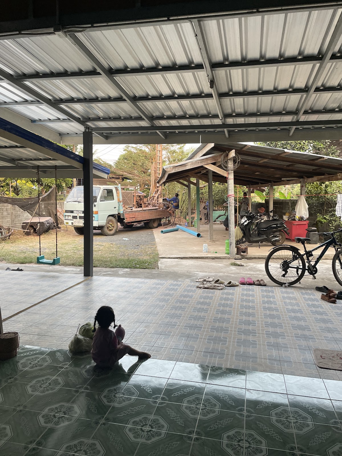 The hot breeze feels like flames licking my back while I enjoy the easy downhill cycle. And although I take this same path often, I notice that it’s not always the same. After a particularly embarrassing incident between me and one of those scrappy dogs a caution light was erected on that road the very next week. There’s a new pork stand outside the house on the corner and it seems to be doing well. A little bit further down the road from my drink stand of choice, the town just wrapped up construction on a water tower and pump. This is a really exciting development for a village where most houses do not have running water, including my own, until about a month ago. The city workers also came in and installed drain pipes on our roads that flood especially badly during the rainy season. And even further down that road in the blank field that separates us from our neighboring tambon, construction is nearing an end on our very first air conditioned cafe.