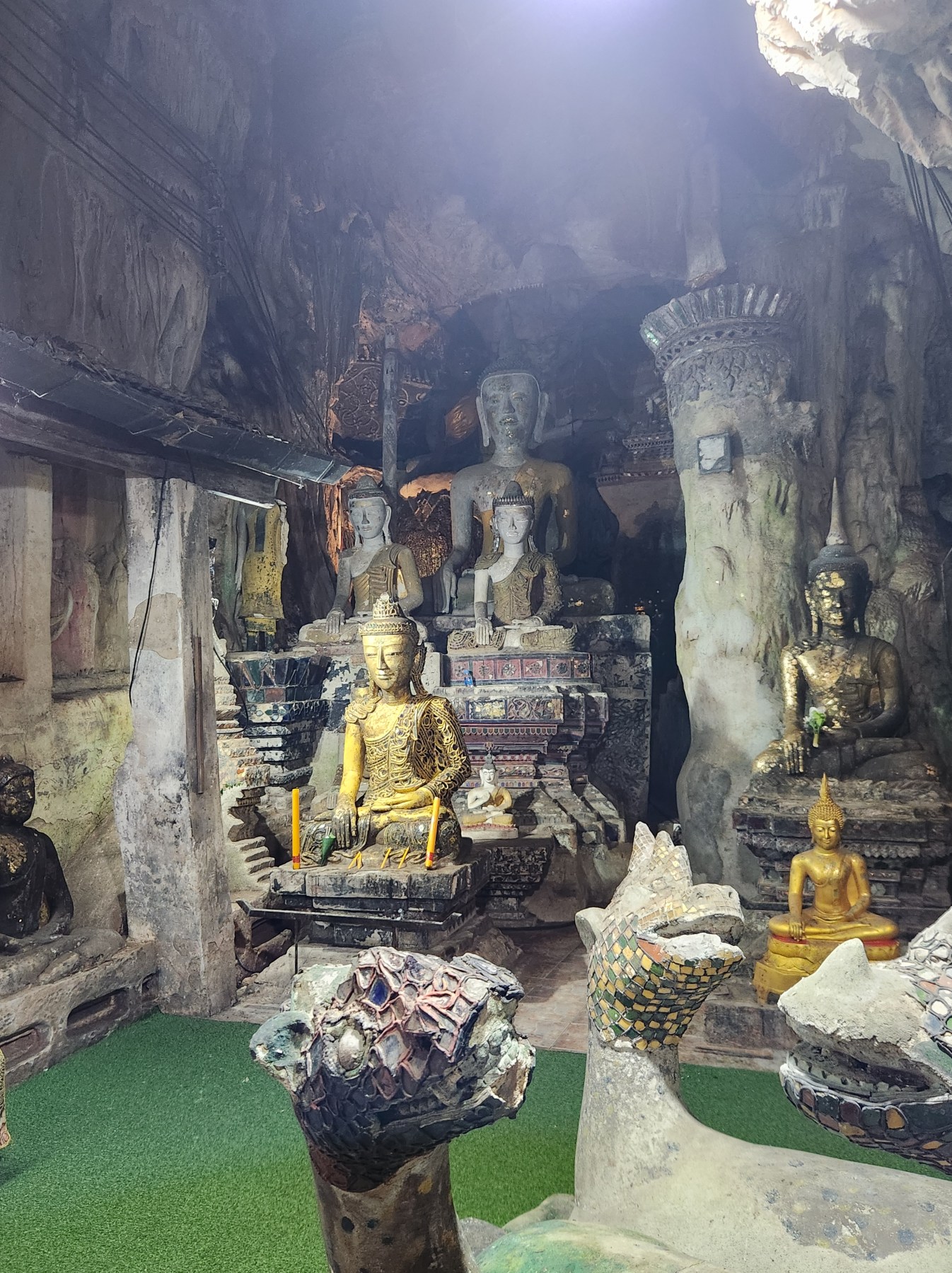 Before the entrance to the cave is a bridge over a pond with coy fish. Coy fish are one of those animals that can instantly put a smile on my face. They are ubiquitous in Thailand and their coloring and symbolism are beautiful. As you enter the cave you ascend a staircase that transports you into an enchanted world. Surrounding you are rich limestone stalactites hanging from the ceiling while artificial lights illuminate the pathway to your first stop: a shrine perched on a platform. Here lies hundreds of ancient Buddha statues. This was my first time ever going to a wat with my A-jaan who is very religious and knowledgeable about Buddhism. He educated me on some history and customs about Buddhism in Thailand.