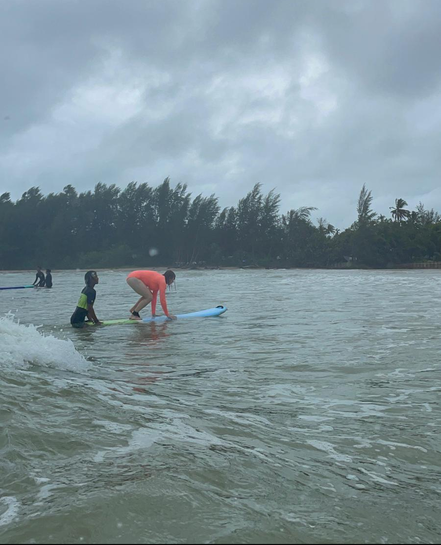 Lilly (Cont.): The hour-long lesson progressed from completely hands-on to as hands-off as we were able to handle. They helped us walk out deep enough, even pushing us part of the way towards the end, turned the board for us, pushed us into the wave, and yelled when we tried to stand up. I have good balance and was able to stand up right away, so after a few runs I was shown how to use my body to gently turn the board. After I was comfortable in the water, free to just try to surf again and again, my instructor challenged me to start mounting and turning the board myself. And oh boy, suddenly it was a different game.