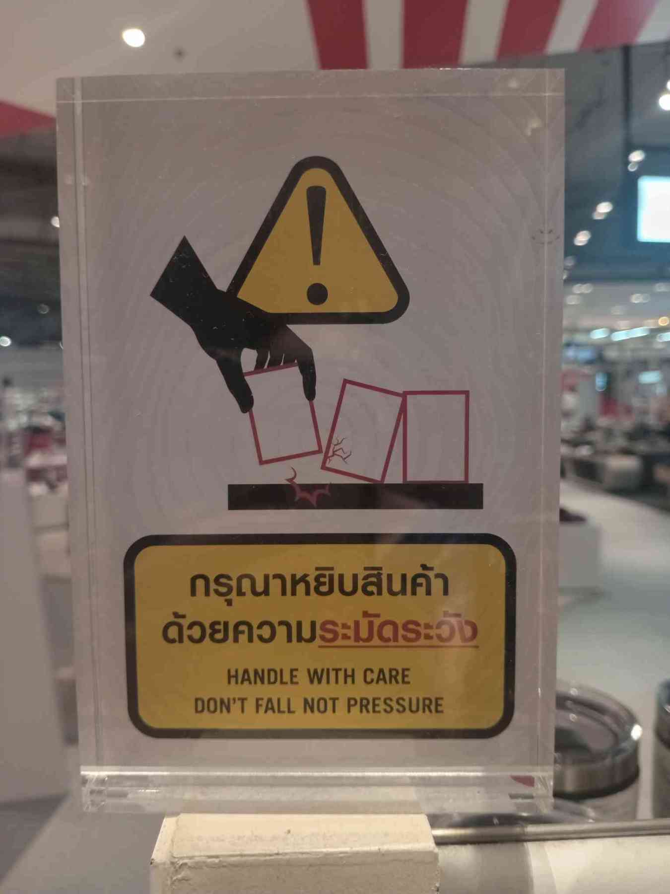 I took this picture in a mall when shopping with a friend for water bottles. While they had the correct usage of “care”, the rest of the warning falls apart a little bit. ‘Don’t fall’ is an instruction applicable to a great many situations (as it’s the rainy season, I’ve been slipping and sliding all over the place on the mud and algae that has sprouted out of nowhere, so I’ve needed this instruction!), but ‘Not pressure’? I wasn’t pressuring my friend into buying a water bottle, so perhaps I heeded this instruction as well. Or maybe I wasn’t supposed to feel pressure if I didn’t fall. I didn’t fall, so I didn’t feel pressure. Whatever it is trying to say, I’m sure I followed it.
