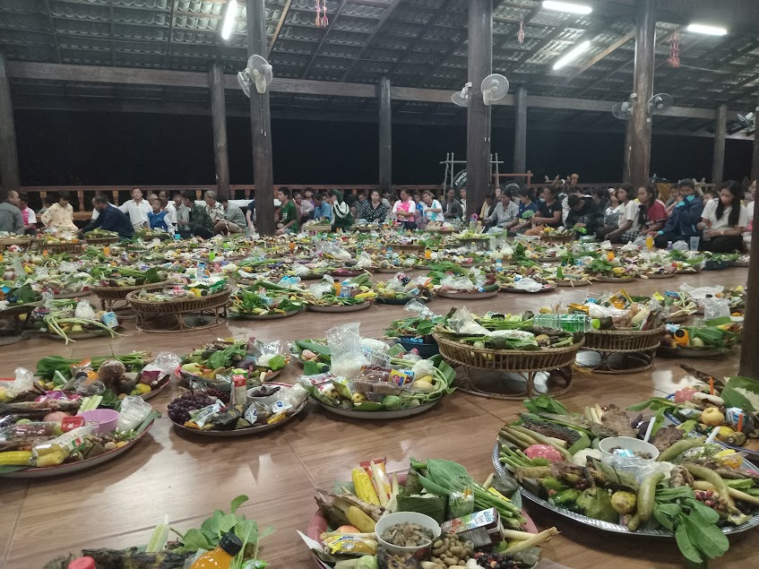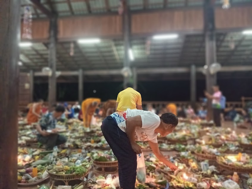 It is believed that on this day the spirits of the ancestors visit their still living relatives and gather to eat the offerings laid out. These offerings range from grilled fish, and sticky rice, to fresh fruits and desserts (kanoms), as well as physical objects like silk scarves and money. I’ve even seen a phone and a lottery ticket added to the pile.