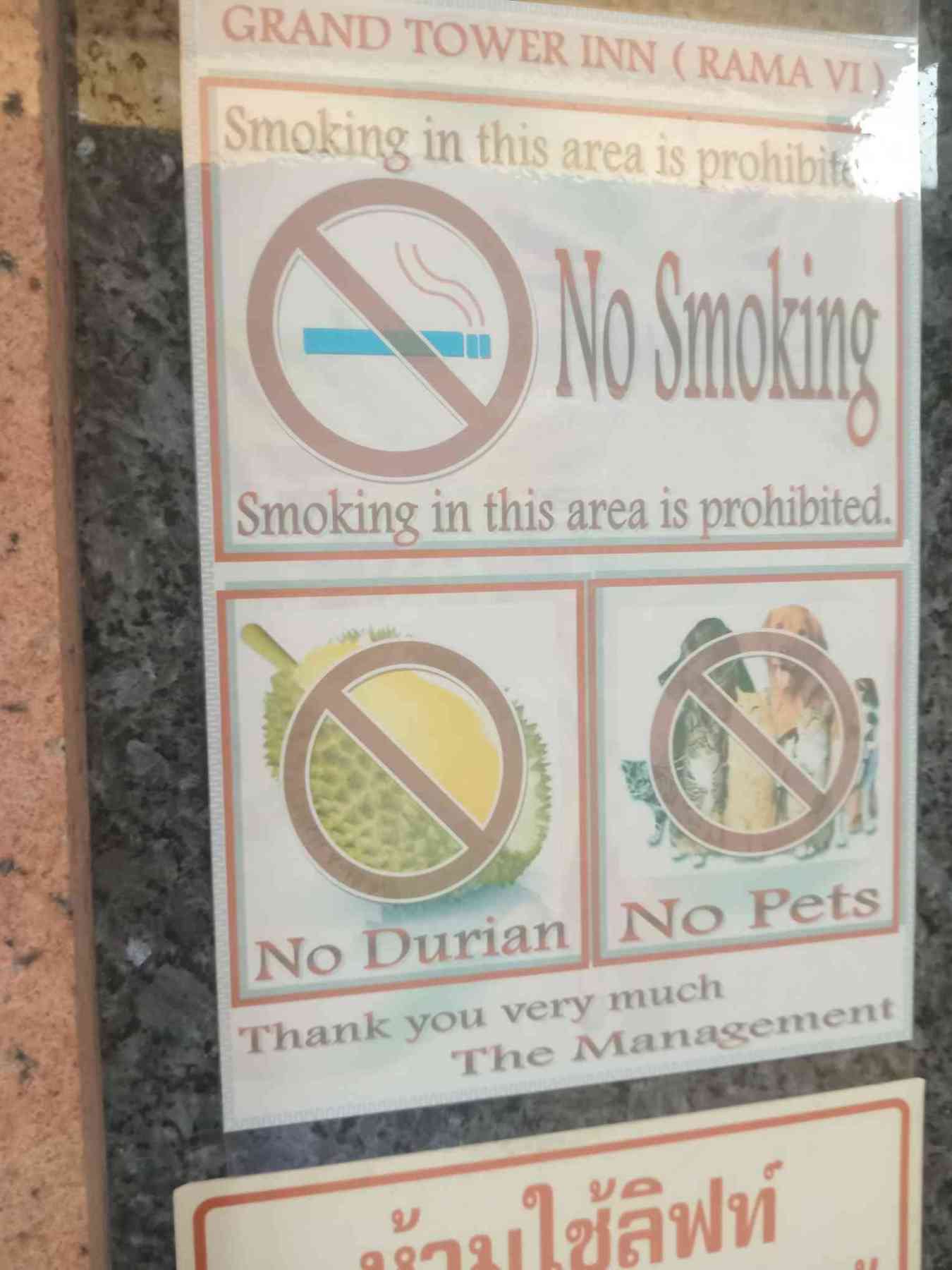 No smoking and no pets are common hotel signs and just good courtesy for spaces often occupied by many people trying to coexist for an evening. Thailand, of course, has to add yet another rule to the list of how to be a good guest – no durian, for the same reasons! Durian, which is notorious for smelling like particularly pungent trash, has been banned at pretty much every hotel I’ve been at. Just a fair warning for those visiting Thailand and hoping to try this exotic, infamous fruit – do it outside!