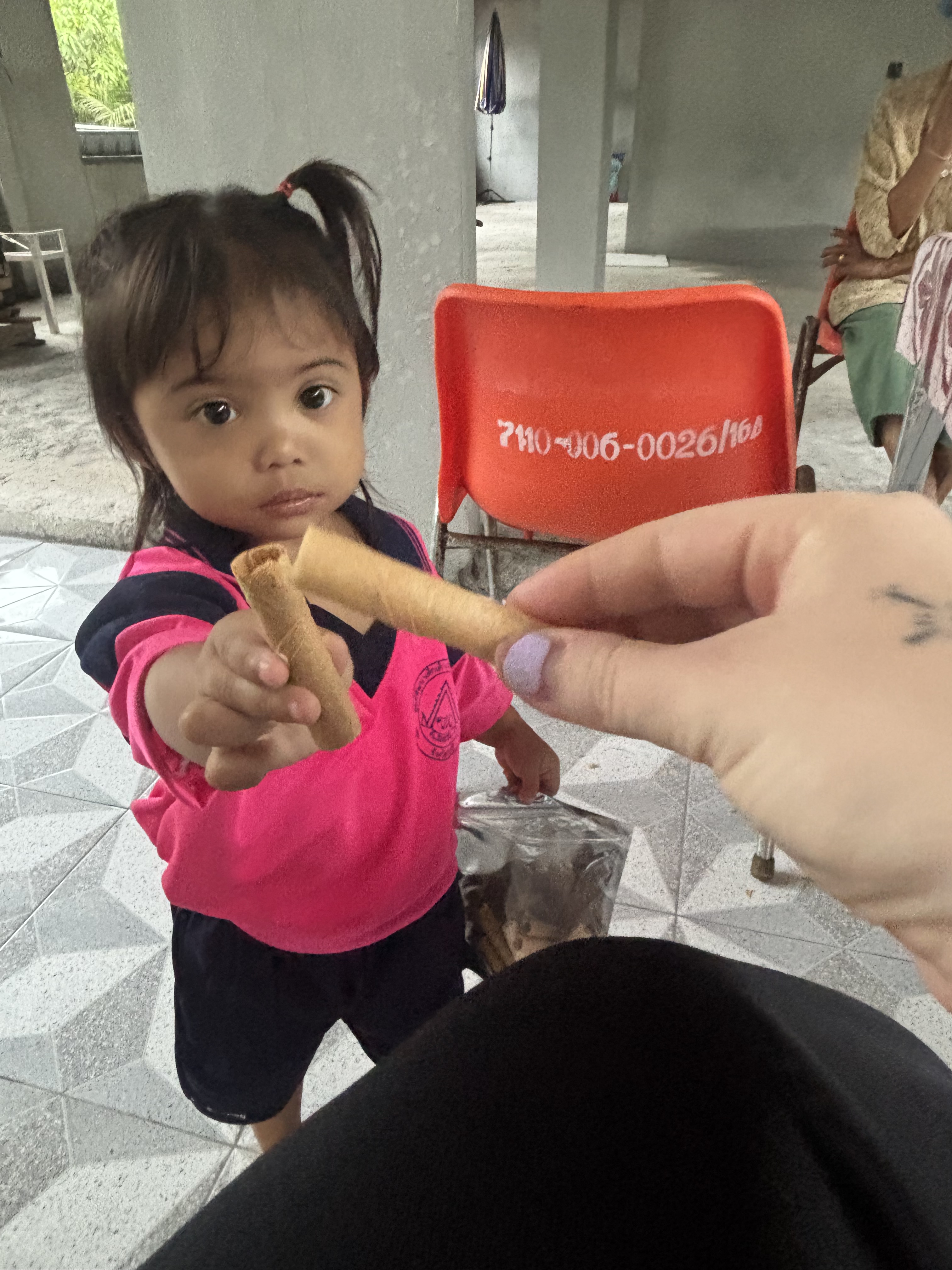 I sat down with my bag and began talking to them about who I was and what I do here. We talked, played with the children, and snacked on crispy coconut sticks together. As I sat with this family, listening to the rain and laughing with the kids, I couldn’t help but feel an overwhelming sense of gratitude. How lucky am I to feel safe and comfortable enough to stop at any home in my community, knowing I will be accepted with open arms?