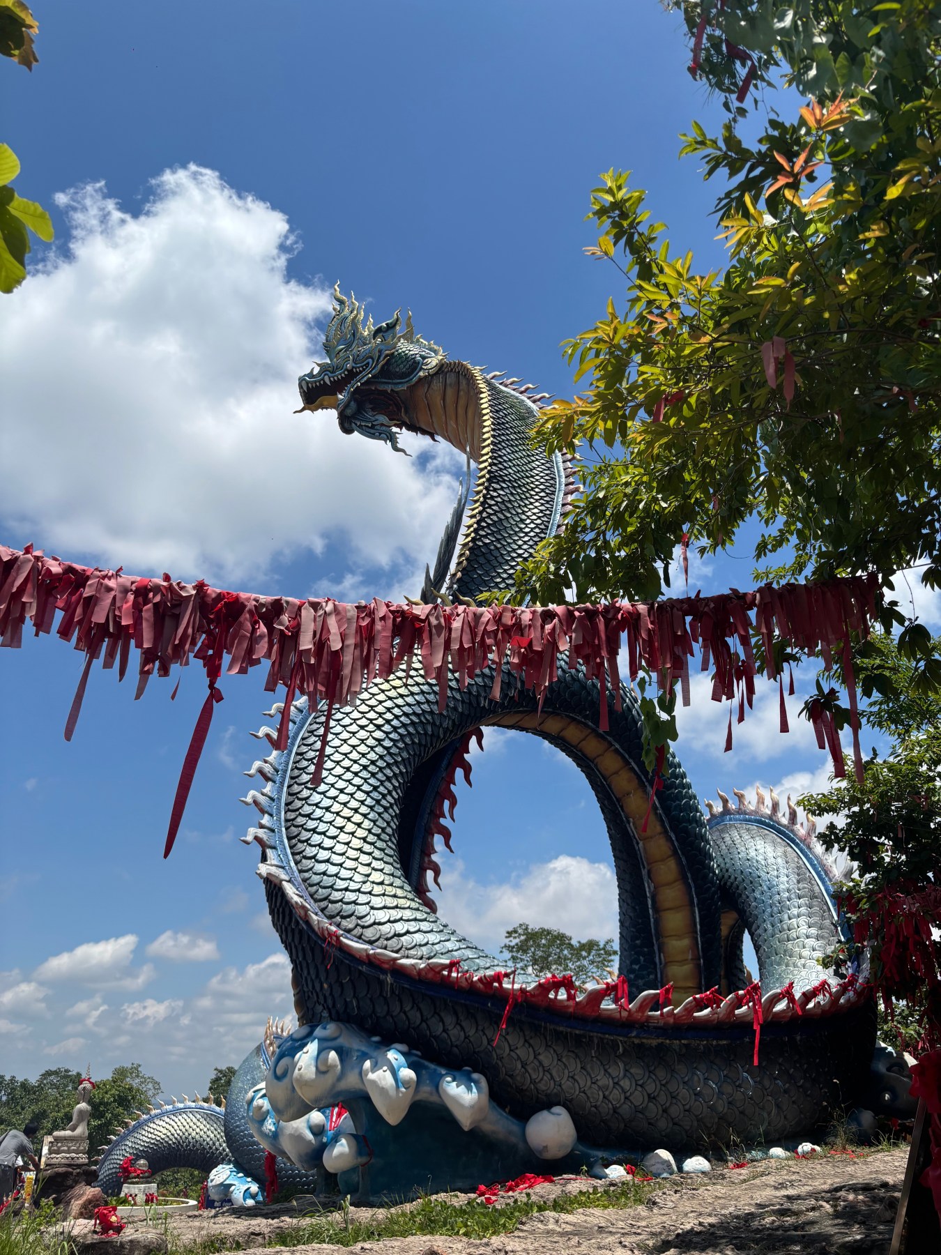 In Mukdahan city, we got to start our trip with bowls of delicious Kao Piak, or Vietnamese noodle soup. We weren’t aware of the strong Vietnamese influence in Mukdahan, so that was a very yummy way to learn about it. Next, we headed to visit the famous Phra Ya, a very large Naga statue with shimmering blue-green scales and a fierce face. The temple is situated at the top of a hill, and you can touch the giant Buddha statue’s fingers while looking across the Mekong River into Laos.