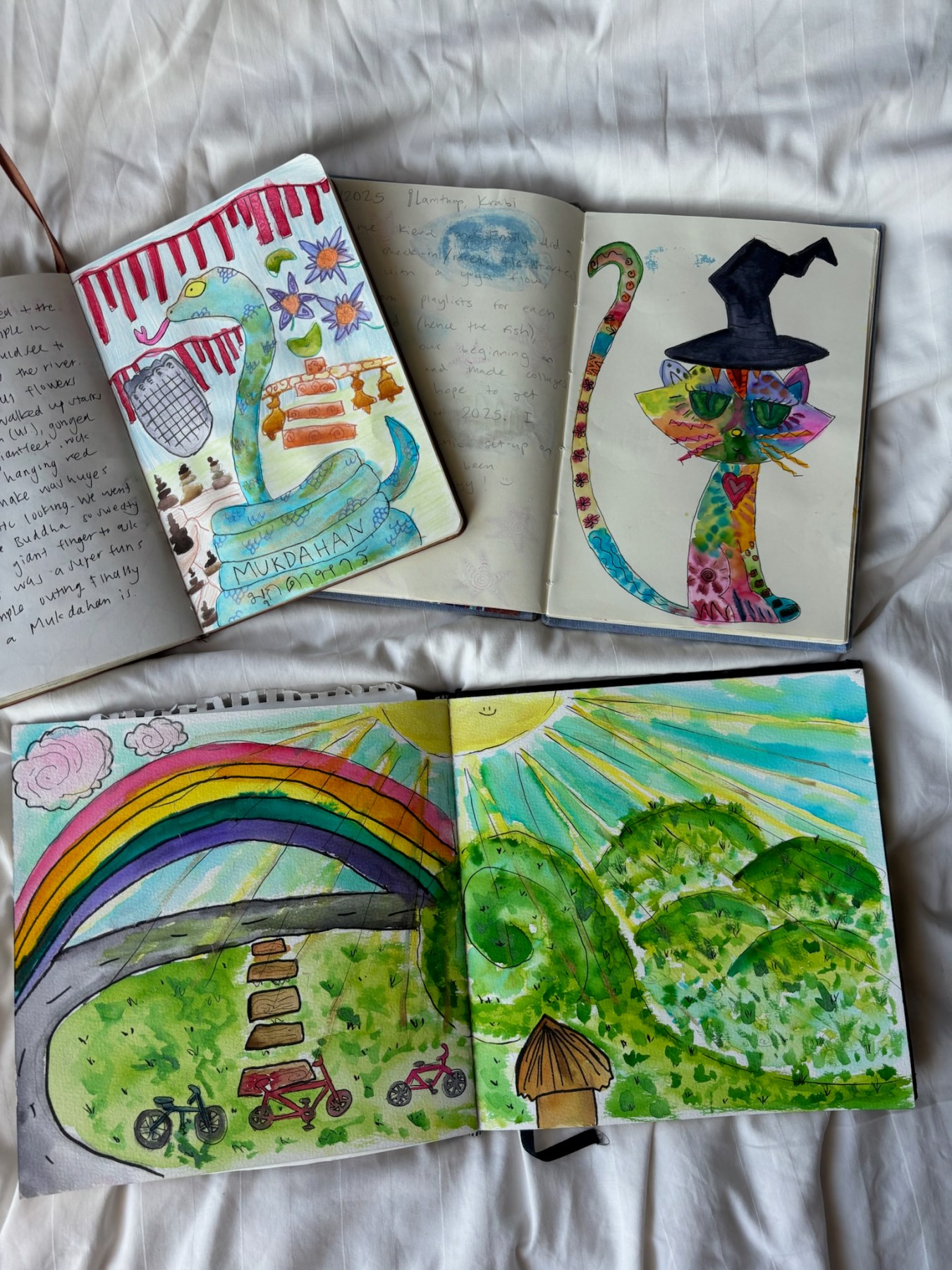 A light rain drizzled on us as we biked through lush green rice fields to get to the dam. We passed by cows, bulls, flowers, hammocks, and roadside markets, soaking up every bit of it. Climbing the stairs to reach the top of the dam, we realized we were being blessed with a rainbow!!! It’s so rare to see a rainbow here, and it felt so special to bear witness to it for the rest of the evening. The dam was glistening with sparkles from the sun, and we knew we had to get closer. Biking down to an inlet of the marshy grounds, we found an area to frolic in together. The terrain was filled with grassy mounds and even a giant spiral shape in the ground. Everything about the experience seemed magical and filled with charm.