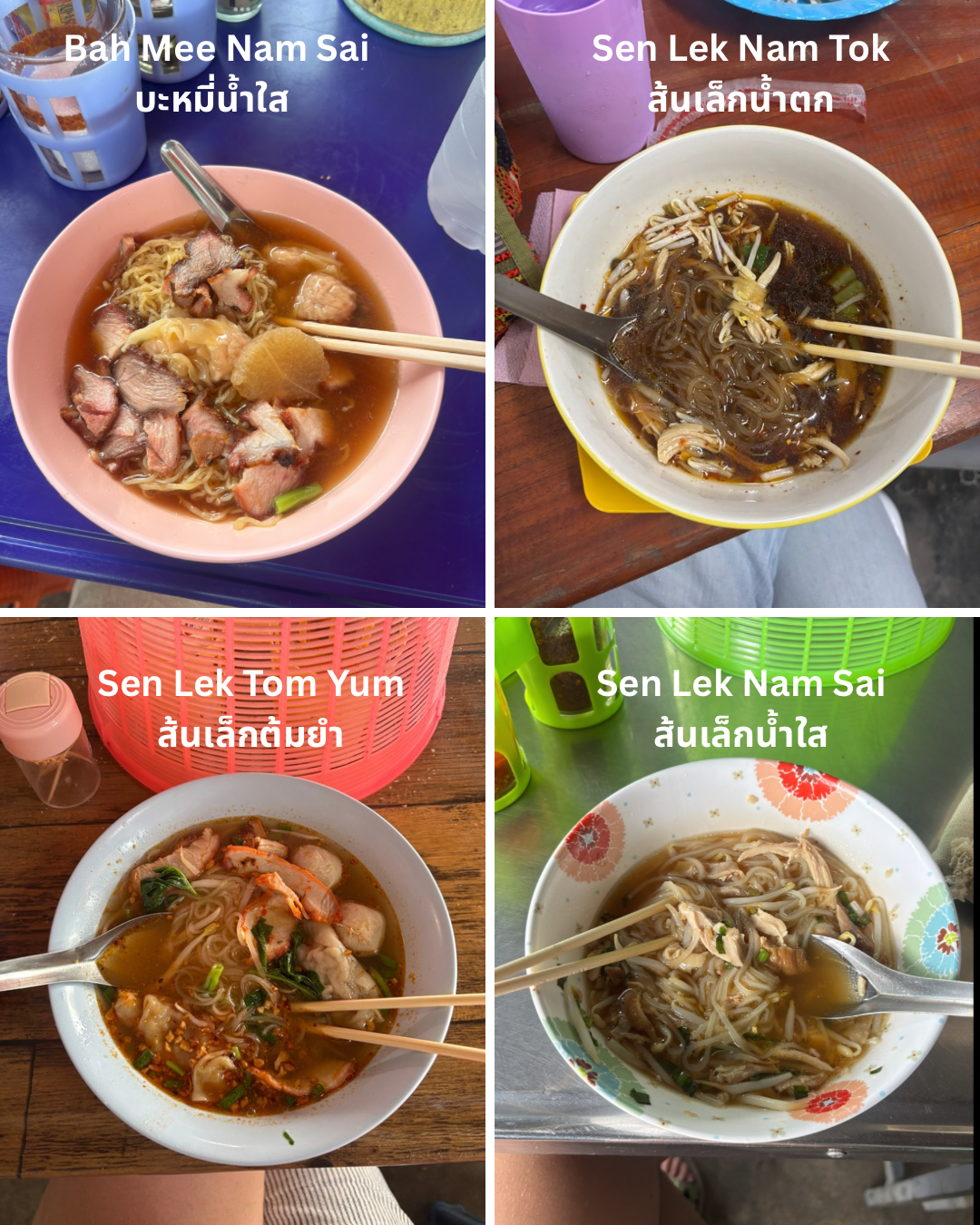 Guay tiaow is a dish that took me a while to figure out because there are so many different ways you can order it and have it prepared. First, there’s the noodle type— sen เส้น + small (mi) หมี่, medium (lek) เล็ก, or large (yai) ใหญ่ size. Or other options altogether;wun sen ใหญ่, a clear noodle, or bami บะหมี่, yellow egg wheat noodles. Then, there’s the broth type— clear (nam sai) น้ำใส, dark (nam tok) น้ำตก, curry (Khao Soi) ข้าวซอย, spicy and sour (Tom Yum) ต้มยำ, or dry (haeng) แห้ง. Depending on the combination of all these factors, you have different types of dishes and therefore different names. You can mix and match based on what you’re feeling depending on the shop you’re at. Some offer all combinations, while others may be more specialized and only sell one to two options.