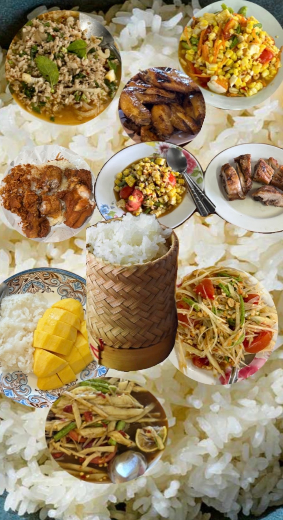 Sticky rice is almost never eaten alone. It’s a companion food, designed as a vessel to transport other flavorful foods from the plate to your mouth. With fried chicken (gai tot) ข้าวเหนียว and crispy grilled onions, it’s salty and crunchy each bite making you reach for more. With papaya salad (Somtam) ส้มตำ and pork larb (lap moo) ลาบหมู, it dilutes the sharp spice and sourness of chilies and lime and soaks up the yummy juices on the bottom of the plate. It pairs perfectly with the smokiness of grilled pork (moo bing) หมูปิ้ง or grilled chicken (gai yang) ไก่ย่าง and the sweetness of mango (mamuang) มะม่วง and condensed milk. No matter the pairing, sticky rice gives structure to the experience. It forces you to eat slowly and intentionally. Eating foods with sticky rice is tactile, communal and complete.